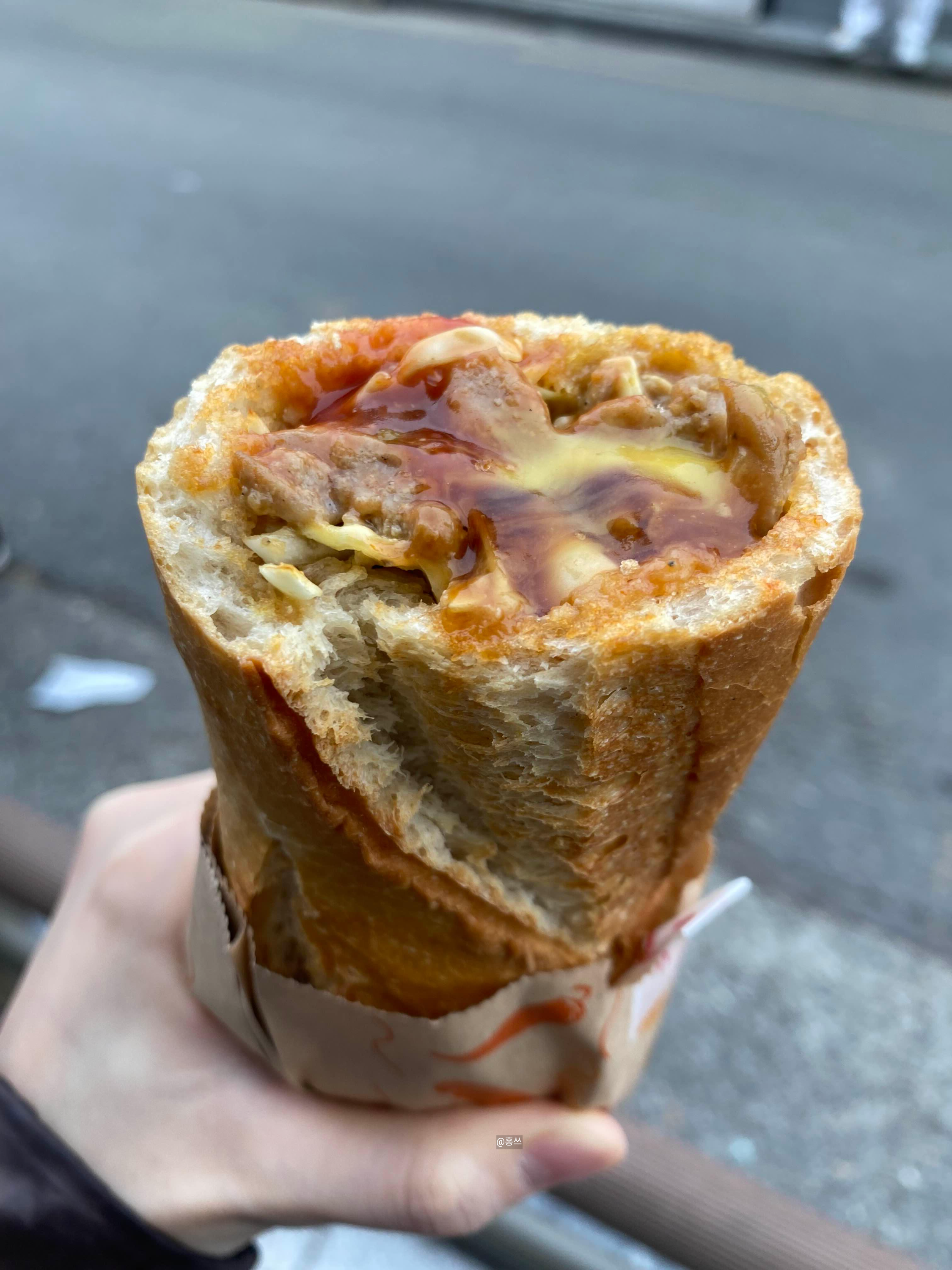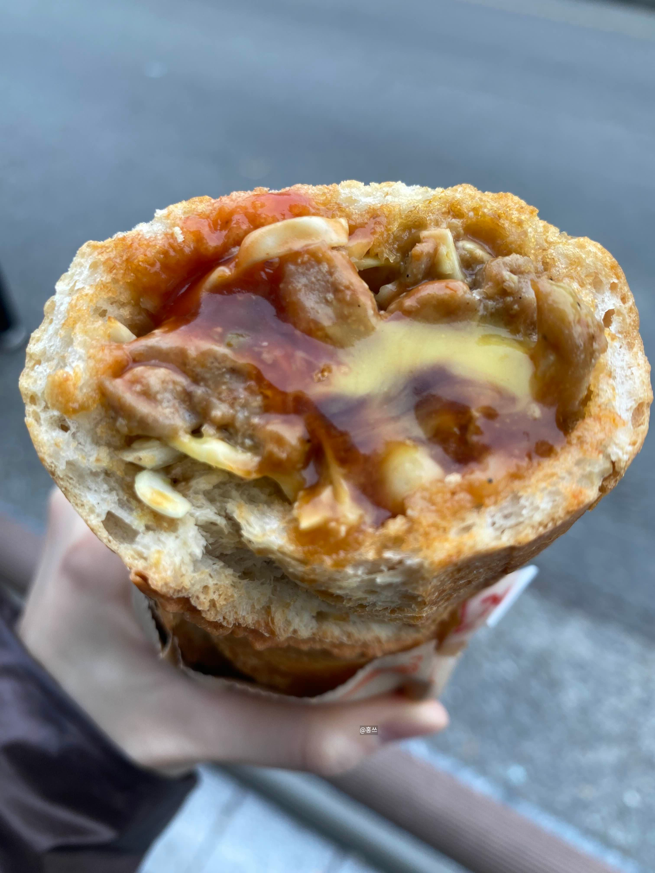 위에 소스가 뿌려져 있는데 안까지 소스가 있었으면 딱이었을 거 같다.