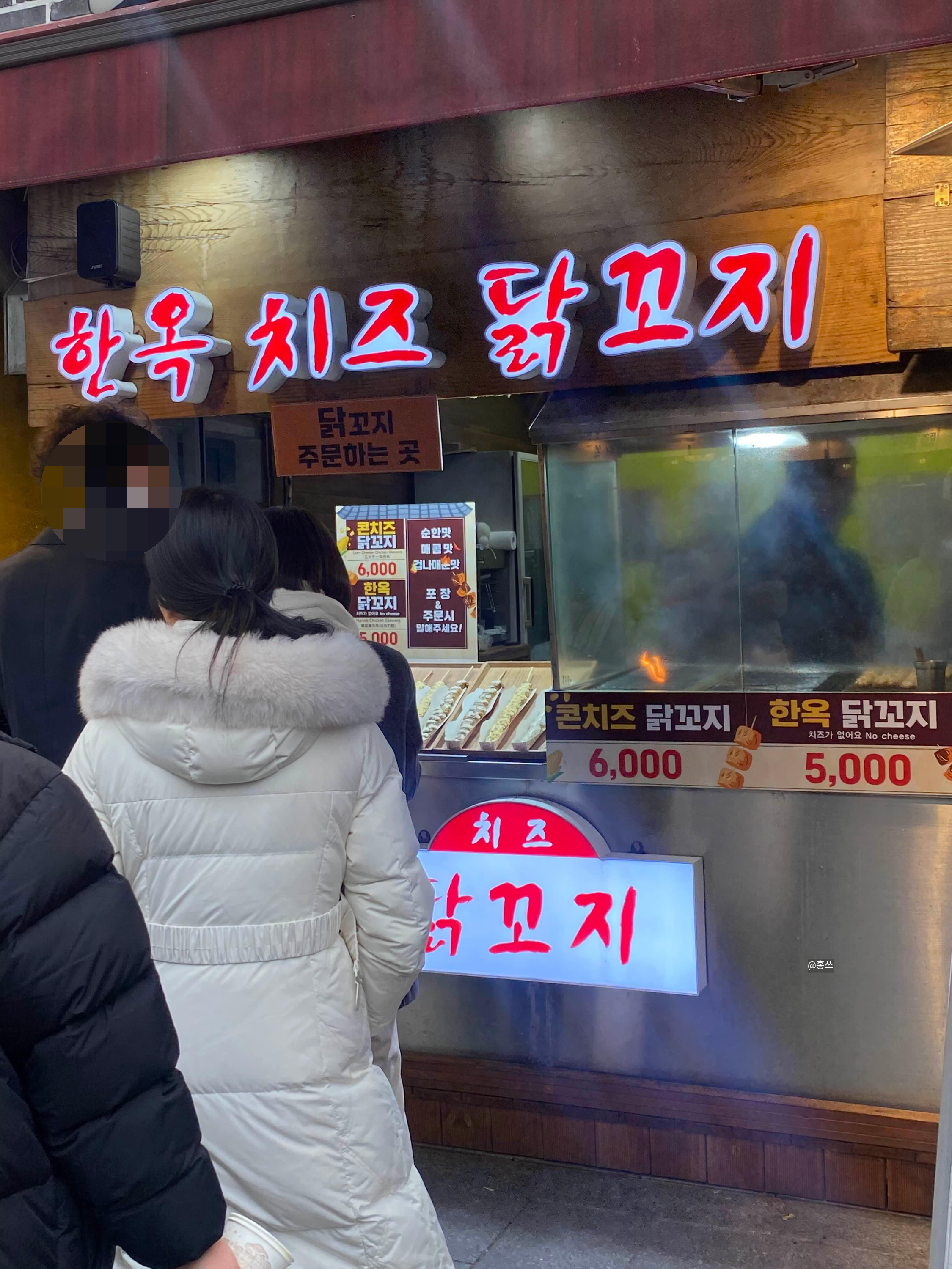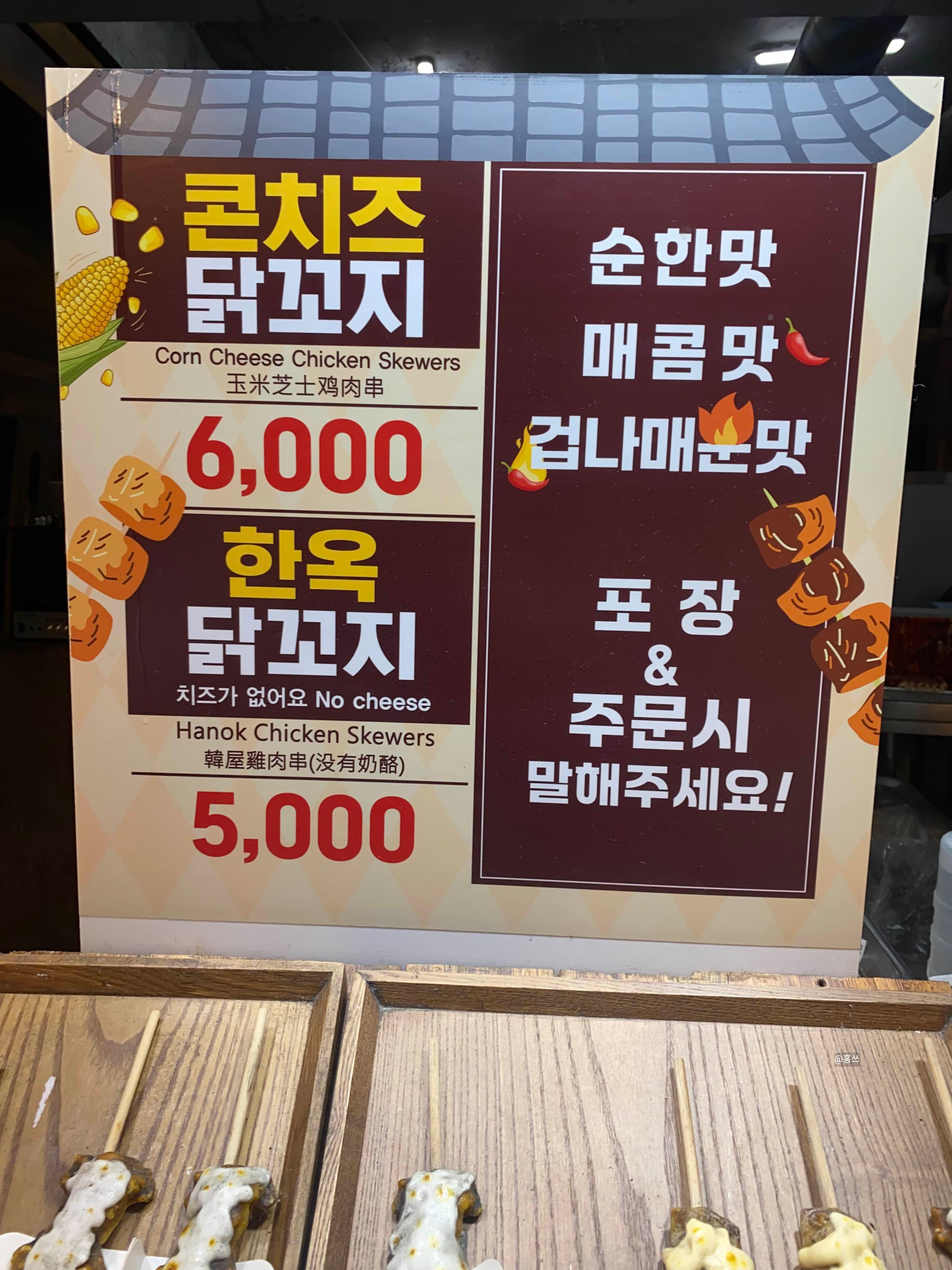 콘치즈닭꼬치랑 한옥닭꼬치(치즈 no) 두 가지 종류에 맛은 순한 맛, 매콤맛, 겁나 매운맛 세 가지이다.