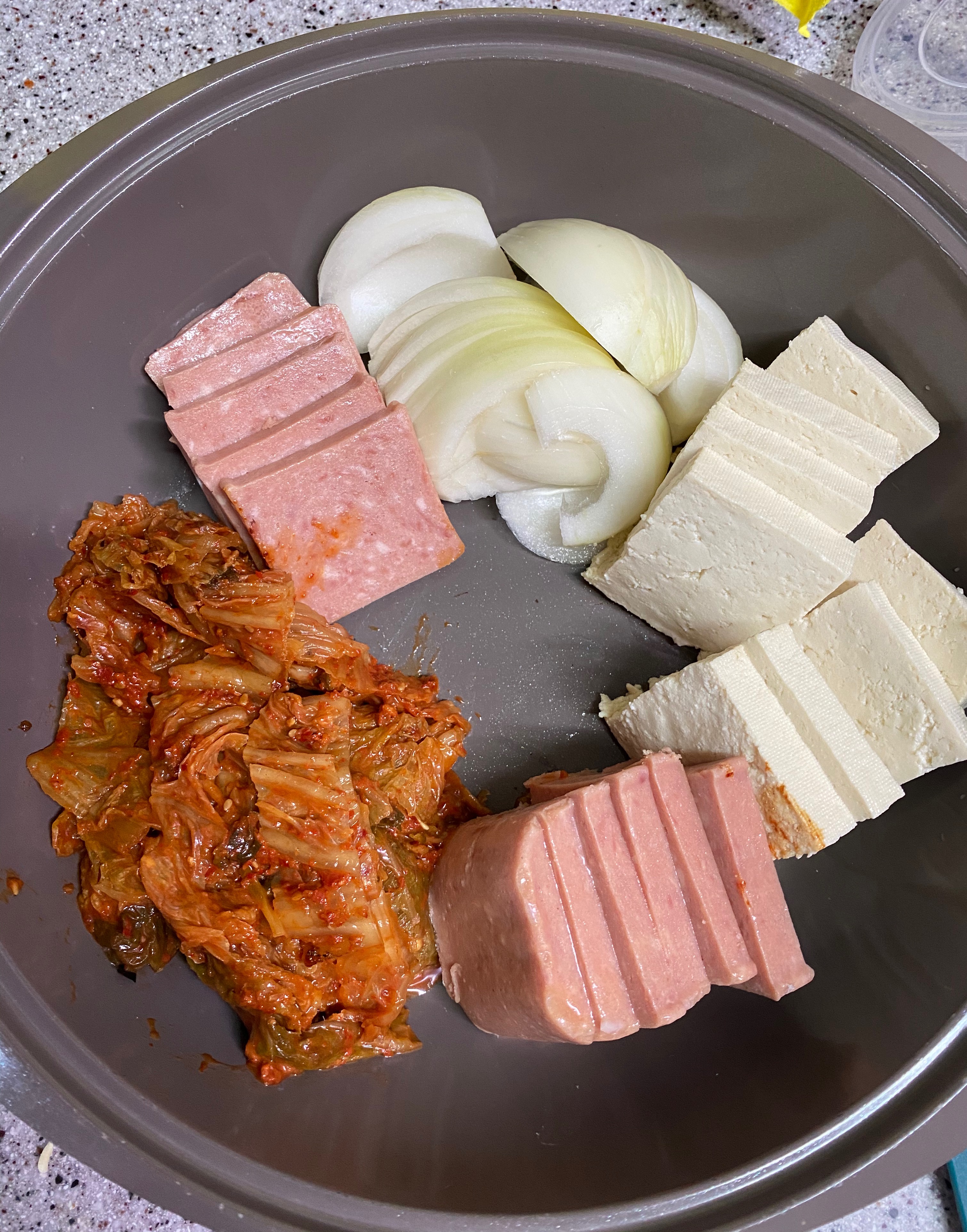처음에 썰어둔 재료들을 냄비에 옮겨서 담아주세요.